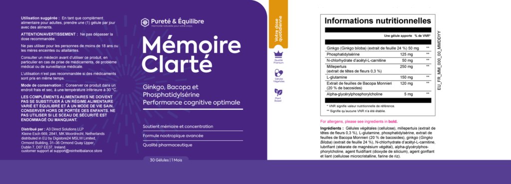 Together, these ingredients work synergistically to support sharper thinking, improved concentration, better memory retention, and overall cognitive balance. Mémoire Clarté is designed as a simple and sustainable solution for daily mental performance support.